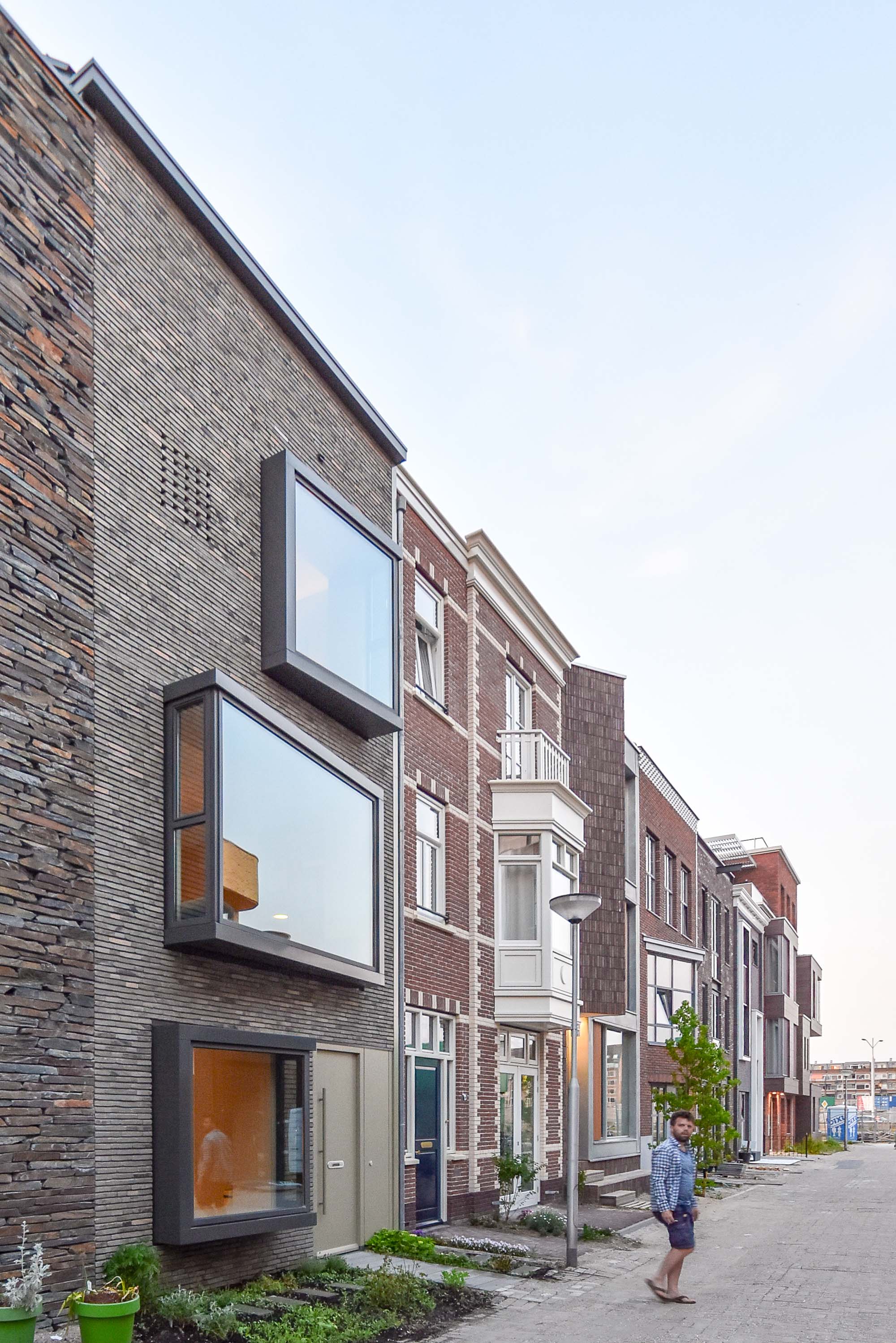In de gevel springen de grote erkerramen in het oog, die in sterk contrast staan met het massieve gesloten gevelvlak. Het gebruik van metselwerk in de gevel was een door de gemeente gestelde voorwaarde. Wij kozen voor een ruwe steen met een natuurlijke uitstraling, waarmee het contrast tussen de gladde, strak vormgegeven erkers en het grillige, gesloten gevelvlak wordt versterkt. De grote erkerramen zorgen voor een open uitstraling en sterke relatie met de straat. Aan de binnenzijde worden ze gebruikt als houten zitmeubel en worden zo onderdeel van de leefruimte.